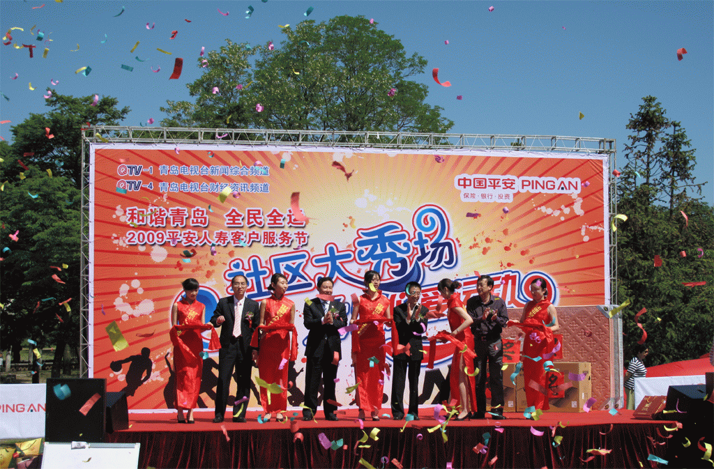 5月23日上午,平安人寿2009年第14届客户服务节开幕式暨青岛电视台《社区大秀场》启动仪式在中山公园顺利举行。青岛电视台新闻综合频道、财经资讯频道颜涛总监、青岛市体育局群体处栾述伦处长及平安人寿青岛分公司刘天东总、徐淼总出席了活动并为启动仪式致辞剪彩,青岛电视台在现场进行了全程录制,并在青岛电视台财经资讯频道进行了播出。